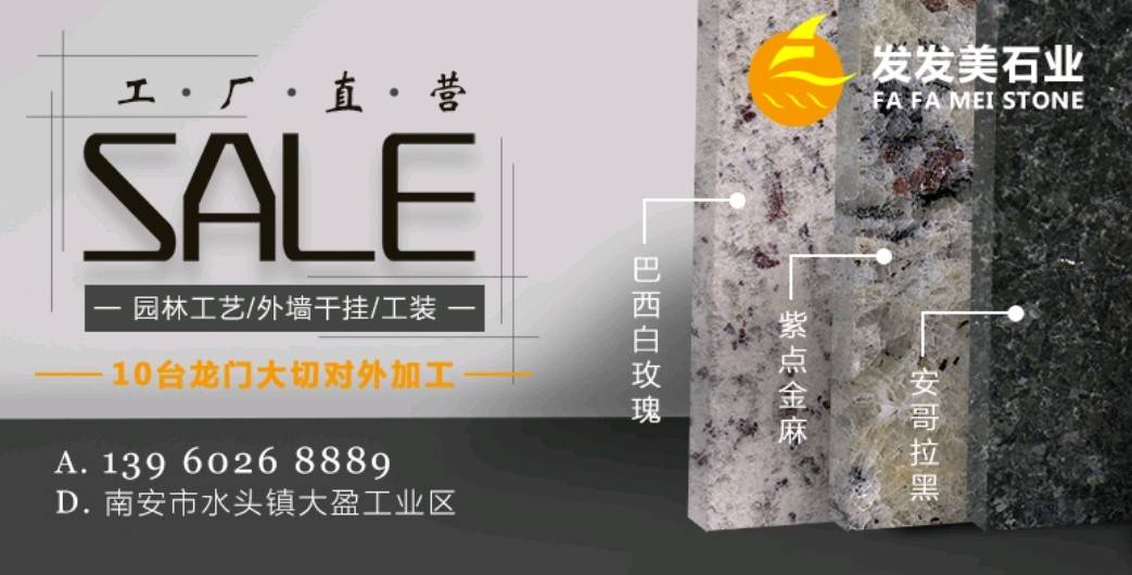 南安發(fā)發(fā)美石雕工藝品有限公司位于324國道邊大盈工業(yè)區(qū),生產各種進口花崗巖,公司擁有10臺龍門切,全自動磨機,5臺紅外線,承接各種出口花崗巖成品板,條板,歡迎洽談。