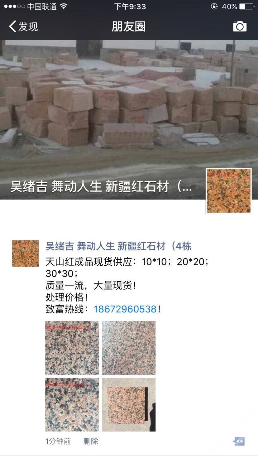 鄯善縣至德石業(yè)有限公司位于美麗的葡萄之鄉(xiāng)~新疆吐魯番鄯善縣鄯善石材工業(yè)園。本公司主要經(jīng)營(yíng)天山紅,新疆紅,鄯善紅,新疆黃,雪蓮花,灰麻等各類新疆石種,擁有先進(jìn)的生產(chǎn)設(shè)備, 雄厚的技術(shù)力量,是一家集礦山開(kāi)采,石材加工,銷售于一體的多年老品牌石材公司。本公司還設(shè)石材銷售點(diǎn)于各個(gè)大型建材市場(chǎng),廣東云浮市思勞,廣東云浮市珠洞,福建省水頭鎮(zhèn)閩南建材市場(chǎng)。承諾滿足不同地區(qū)的采購(gòu)商多種需求。我們期待您的來(lái)電,竭誠(chéng)歡迎新老客戶共創(chuàng)雙贏。