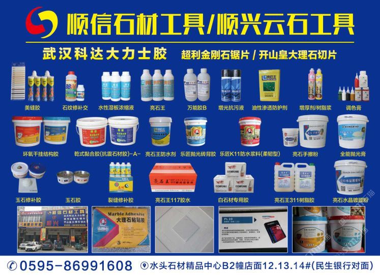南安市順信石材工具有限公司成立于1999年,位于有“中國(guó)石材城”之稱的福建省南安市水頭鎮(zhèn)閩南建材市場(chǎng)內(nèi),分設(shè)石材工具護(hù)理部、干掛部?jī)蓚€(gè)門(mén)市部,是一家批發(fā)、零售兼營(yíng)的石材配套工具。多年來(lái),憑借產(chǎn)品的齊全、質(zhì)量的保證、信譽(yù)的可靠、服務(wù)的周到,本商行在國(guó)內(nèi)同行中已形成自己的地位和影響,并擁有龐大的客戶群體,產(chǎn)品銷(xiāo)至國(guó)內(nèi)各大石材生產(chǎn)基地。我們代理的品牌有:武漢科達(dá)大力士膠、環(huán)氧膠、化學(xué)錨栓、干掛膠、植筋膠等產(chǎn)品系列;亮石王防護(hù)劑、防古水、水晶膠、樹(shù)脂膠、友豐比利蠟等產(chǎn)品;粵邦消紋劑、染色劑、百亮鋼絲棉、百潔墊;旗魚(yú)、非爾、柏興、順輝、背栓螺絲;各種款式干掛件、幕墻材料輔助產(chǎn)品;磨料磨具品牌有益和、超利、順興、閩福、芒果、金山、金鋒、智輝等;進(jìn)口、國(guó)產(chǎn)防古刷、亞光磨料、大理石磨料;意大利開(kāi)山皇大理石刀具、微晶石刀具、電鍍切片、超利金鋼石切割片、軟磨片、翻新片、金鋼盤(pán)、樹(shù)脂盤(pán);大小規(guī)格刀具、鉆頭、雕刻工具齊全;金鋼石異形輪、石材夾具、吊具、吊繩、勞保用品;電動(dòng)工具、氣動(dòng)工具、銅條、鋼條、合金工具等各種各樣產(chǎn)品齊全。
