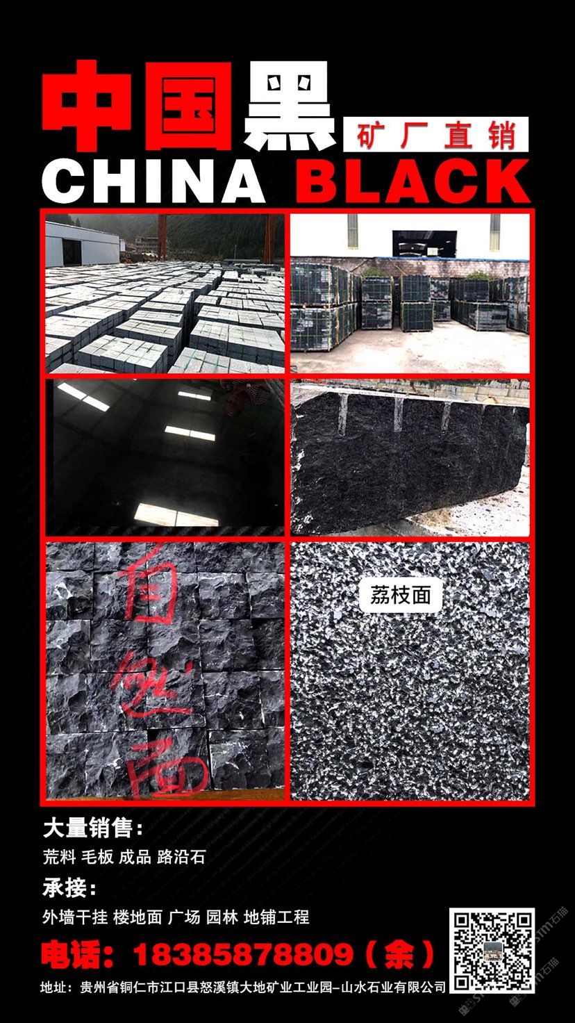 大地礦業(yè)-山水石業(yè)成立于2019年,注冊資金8000萬,位于貴州銅仁,是一家集礦石開采、開發(fā)、加工、銷售為一體的大型民營企業(yè)。 公司2010年開始開發(fā)石材,此石材命名為:“中國黑”?,F(xiàn)已取得采礦權(quán)并有3本采礦證,采礦面積4.65平方公里,擁有三千多畝開采權(quán),年開采量達到10萬立方米。   本礦山資源儲藏量大,質(zhì)地均勻,色差小,經(jīng)質(zhì)監(jiān)部門檢驗合格,符合一類建筑使用要求,適合外墻面干掛,柱面、樓地面、廣場、園林、路沿石等室內(nèi)外石材工程飾面裝修,荒料石、板材出口東南亞、中東等國家和地區(qū)。   本公司以誠信經(jīng)營為本,秉承顧客至上的服務(wù)理念,期待與各界朋友合作,共創(chuàng)美好未來