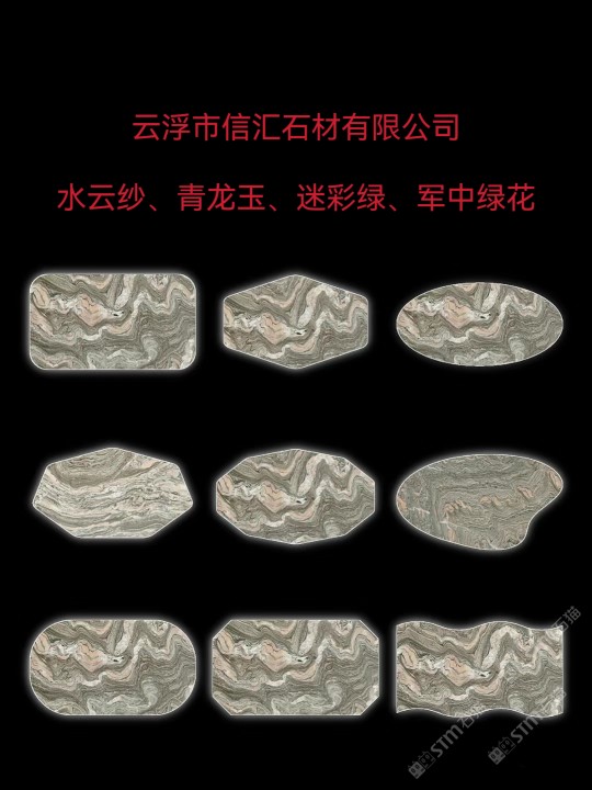 云浮市信匯石材有限公司主要經(jīng)營土耳其云多拉灰(歐努礦、美特碼礦),奧特曼(旺程礦、捷成礦),金鑲玉、畢加索灰,主營:青龍玉、水云紗、迷彩綠!