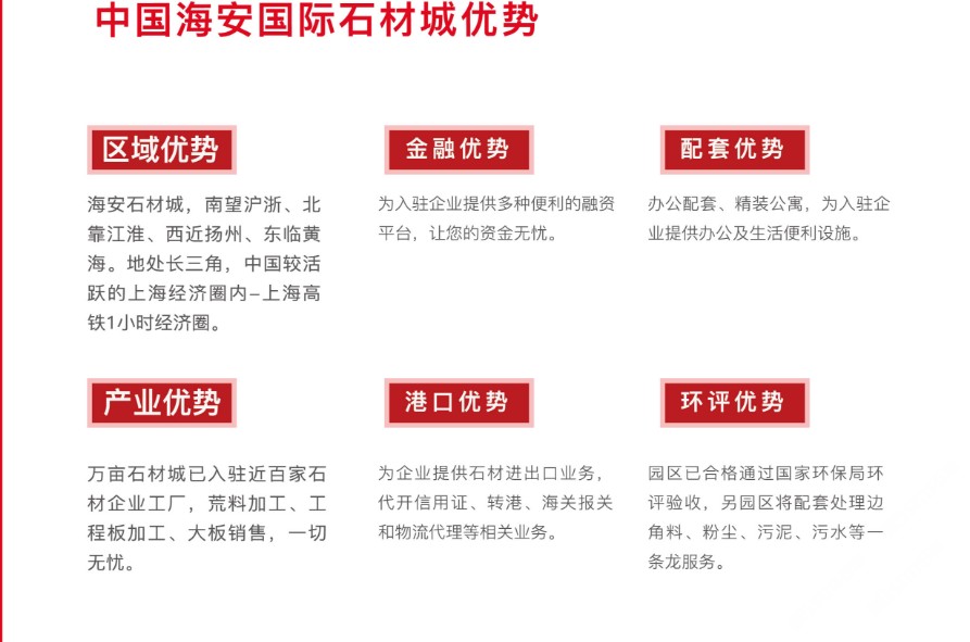 大型石材加工區(qū)、異型、雕刻加工區(qū)、馬賽克生產(chǎn)區(qū)、崗石、石英石生產(chǎn)加工區(qū)、荒料保稅區(qū)、大板展示區(qū)、奇珍玉石區(qū)、園林景觀區(qū)、板材交易區(qū)、物流園區(qū)、石材機械制造區(qū)、商務休閑娛樂配套服務區(qū)。