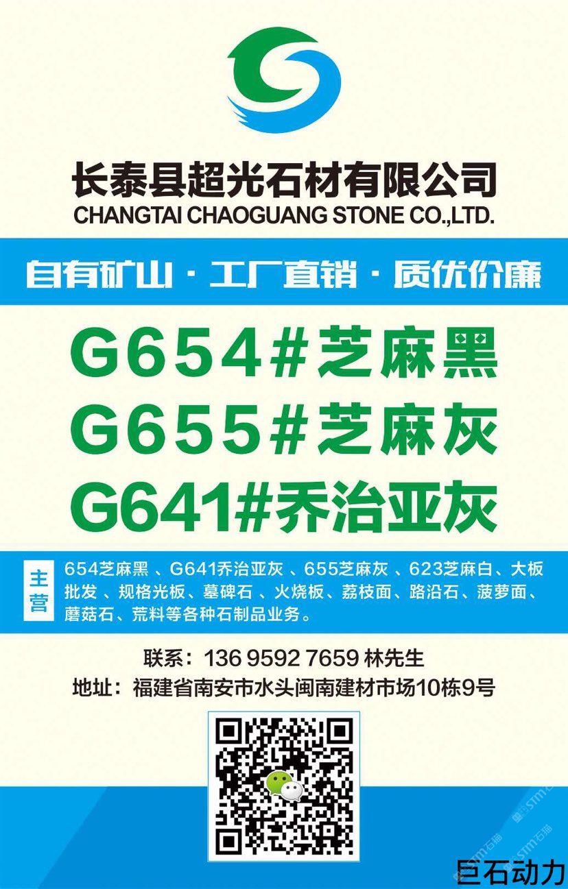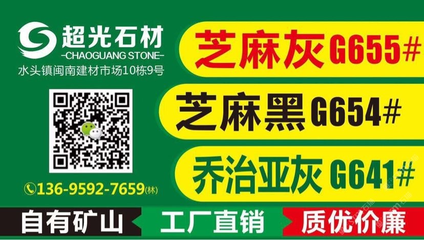 超光石材主營:654芝麻黑 、G641喬治亞灰 、655芝麻灰 、623芝麻白,大板批發(fā) 、規(guī)格光板、墓碑石 、火燒板、荔枝面、路沿石、菠蘿面、蘑菇石、荒料等各種石制品業(yè)務