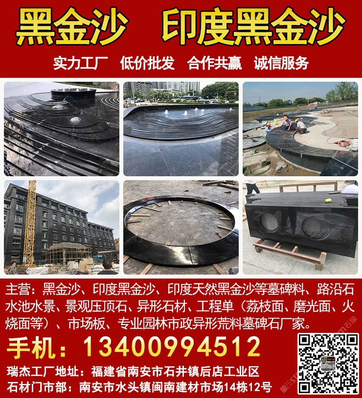 發(fā)布信息: 黑金沙水景工廠-瑞杰黑金沙林總13400994512主營(yíng):黑金沙、印度黑金沙、印度天然黑金沙、印度黑色石材、等墓碑料、路沿石、水池水景、景觀壓頂石、異形石材、工程單(荔枝面、磨光面、火燒面等)、市場(chǎng)板、專(zhuān)業(yè)園林市政異形荒料墓碑石廠家,實(shí)力工廠、低價(jià)批發(fā)、合作共贏、誠(chéng)信服務(wù). 工廠地址:福建省南安市石井鎮(zhèn)后店工業(yè)區(qū),門(mén)市部:南安市水頭鎮(zhèn)閩南建材市場(chǎng)