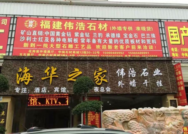 福建偉浩石材 聯(lián)系人:魏成偉    150****9991 查看 152****4789 查看 主營范圍: 大板批發(fā)、礦山、荒料、花崗巖加工、異型加工、 企業(yè)地址:福建南安水頭樸里工業(yè)區(qū);中閩3棟4號,