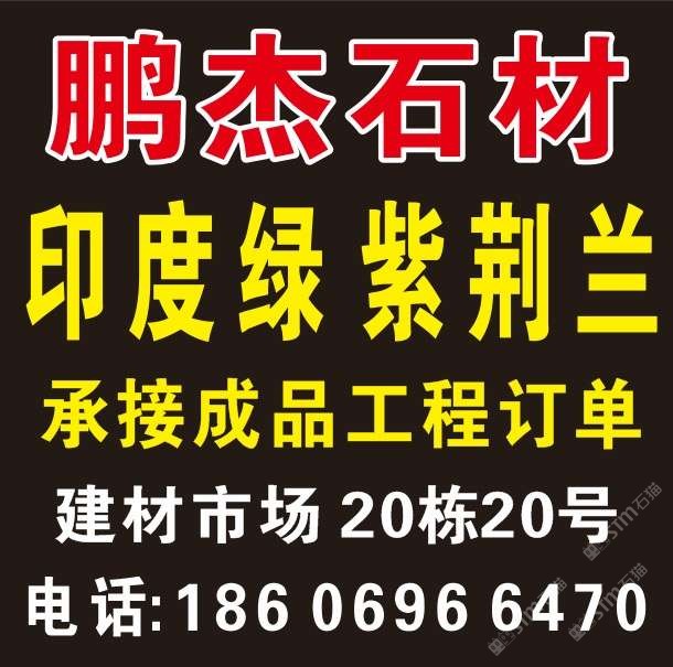 鵬杰石材 聯(lián)系人:李圣汶    186****6470 查看 186****6470 查看 主營范圍: 荒料、花崗巖加工、異型加工、大理石加工、碑石加工、石材雕刻、石材外貿(mào)、 企業(yè)地址:福建泉州南安市水頭鎮(zhèn)閩南建材市場(chǎng)23棟1號(hào)
